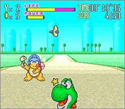 ![]() Haltet alle Bösewichte von Yoshi und euch fern! Wer mit Nintendo-Konsole aufgewachsen ist, fühlt sich in dem Spiel sofort heimisch. Gegner, Levelgestaltung und Charaktere sind, wie in fast jedem 16-Bit Mario Spiel haargenau gleich. Mario ist das ganze Abenteuer lang auf Yoshi's Rücken unterwegs, allerdings sieht man nun die Welt direkt durch des Klempners Augen, denn bei Yoshi's Safari spielt man aus der First Person Ansicht. So hat man andauernd Yoshi's Kopf vor sich, der bloß nicht getroffen werden sollte, da sonst etwas Energie flöten geht. Geschossen wir mit großen Gummiball-ähnlichen Kugeln, die auch mit Dauerfeuer herhalten können. Allerdings gibt es hier, genau wie bei der Lebensenergie eine Leiste. Wenn diese aufgebraucht ist, muss erst einmal gewartet werden, bis sich diese wieder auffüllt. Yoshi läuft durch einen vorgefertigten Parcours, der sehr stark an Mario Kart erinnert. Dabei kann an wenigen Stellen der Weg bestimmt werden. Gegner warten zahlreiche auf euch, die allerlei Münzen und andere Extras fallen lassen. Typische Mario-Utensilien (wie Pilze oder Blumen) verhelfen euch z.B. zu mehr Dauerfeuer oder Energie. ![]() Weder ihr noch die Gegner sollten Yoshi verletzen! Wenn man sich die Verpackung und das Spiel selbst anschaut, dann ist man der Meinung eine schlechte Raubkopie in den Händen zu halten, da gar nichts nach typischer Nintendo Qualität aussieht. Die Figuren sind nicht so schön und irgendwie fehlt der Hang zum Detail, den Nintendo sonst immer pflegt. Trotzdem verbirgt sich hinter diesem Titel eine echte Spaßgarantie, die bestimmt nicht mehr so schnell los lässt und den Kauf eines Super Scopes nun endlich doch rechtfertigt! Sauber!
